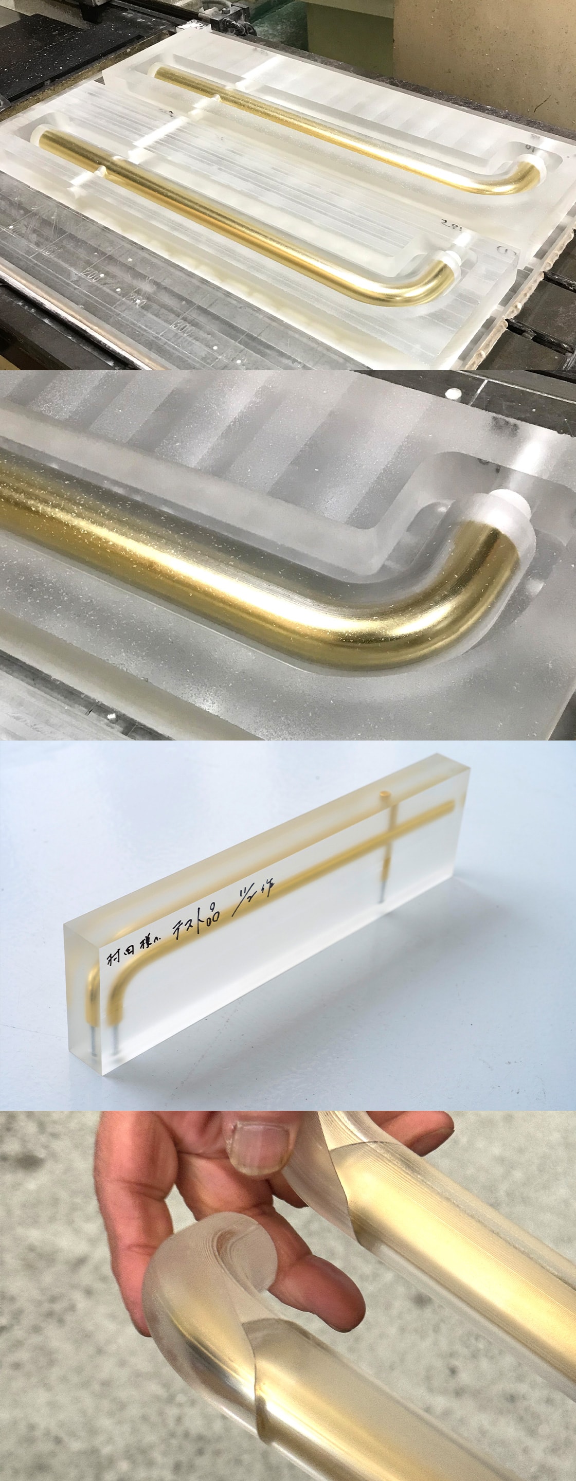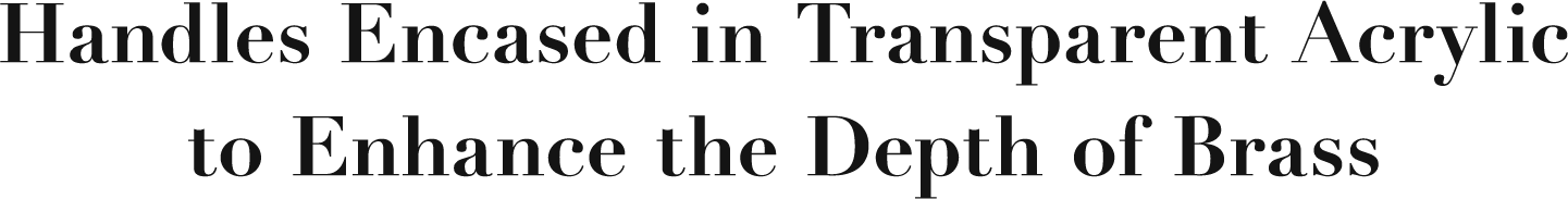 The design gives the impression of brass floating within transparent acrylic, with the brass gradually developing a patina over time.